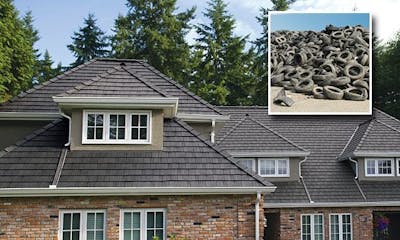 Euroshield roofing products were created 20 years ago with the goal of diverting and recycling the tremendous deluge of used tires ultimately destined for landfill. 250-1,000 rubber tires are used in a Euroshield roof for an average sized home.